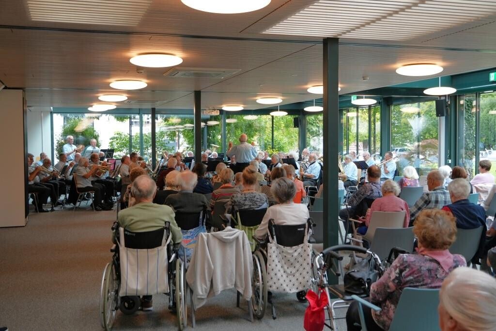 Wie früher richteten wir uns gegen 1500 Uhr im Alterszentrum in Weinfelden für das übliche Nachmittagskonzert ein. Leider war auch dieses Jahr das kühle Wetter für ein Gartenkonzert nicht einladend, sodass wir abermals im Saal musizieren mussten. Trotzdem war es für uns eine Freude, die Bewohner und das Personal mit unseren Konzertstücken zu unterhalten. Der Verwalter bedankte sich herzlich für unser Erscheinen. Herzlichen Dank für die anschliessend servierten feinen Snacks und Getränke!