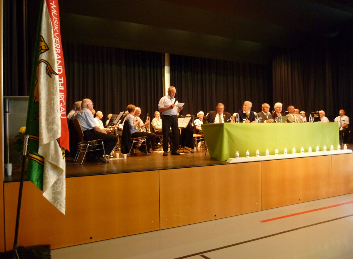 Die Tagung wurde um 10.30 Uhr durch unsere Musik mit dem Marsch „In Harmonie vereint“ eröffnet. Die Begrüssungsworte folgten durch den Präsidenten der MG Roggwil und des Gemeindepräsidenten. Anschliessend führte der Präsident Hans-Rudolf Ebneter wieder speditiv durch die Traktanden, umrahmt durch unsere Musikstücke „Veteranenlied“, und zum Totengedenken “ Der gute Kamerad“.