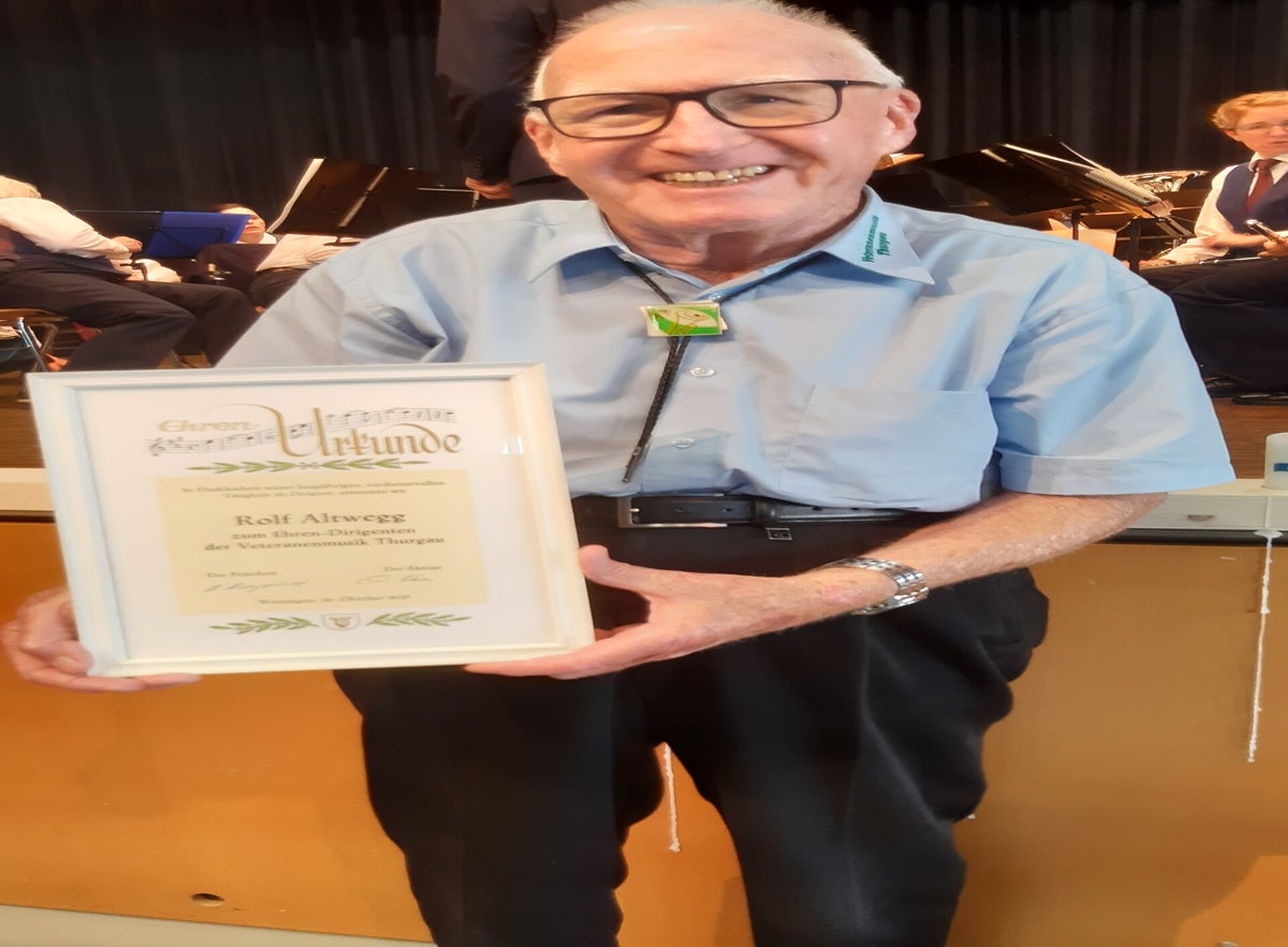 Beim letzten Traktandum erhob sich unser Präsident Hans Hangartner und berichtete über den interessanten Musiklebenslauf unseres Dirigenten Rolf Altwegg und ernannte ihn anschliessend zum Ehrendirigenten unserer Veteranenmusik.